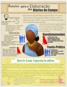O diário de campo é uma produção individual e difere de uma lista de atividades realizadas e fragmentos de situações. A lista e os fragmentos compõem o que chamamos de Caderneta de Campo. O diário é um “pré-texto” em que se organiza as observações e situações vividas em campo incluindo no texto análises, questionamentos e contemplando a articulação entre teoria e prática. A coordenação de estágio desenvolveu um pequeno Roteiro para Elaboração dos Diários de Campo.